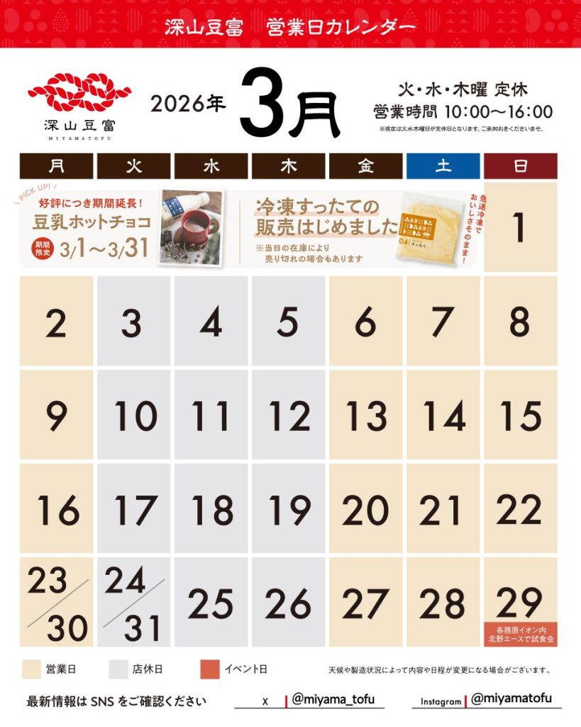 深山豆富店は現在、毎週火曜日・水曜日・木曜日が定休日です。